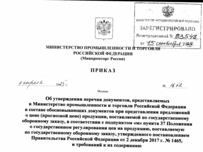 Приказ Минпромторга РФ от 04.04.2025 № 1652 «ОБ УТВЕРЖДЕНИИ ПЕРЕЧНЯ ДОКУМЕНТОВ, ПРЕДСТАВЛЯЕМЫХ В МИНИСТЕРСТВО ПРОМЫШЛЕННОСТИ И ТОРГОВЛИ РОССИЙСКОЙ ФЕДЕРАЦИИ В СОСТАВЕ ОБОСНОВЫВАЮЩИХ ДОКУМЕНТОВ ПРИ ПРЕДСТАВЛЕНИИ ПРЕДЛОЖЕНИЙ О ЦЕНЕ (ПРОГНОЗНОЙ ЦЕНЕ) ПРОДУКЦИИ, ПОСТАВЛЯЕМОЙ ПО ГОСУДАРСТВЕННОМУ ОБОРОННОМУ ЗАКАЗУ, В СООТВЕТСТВИИ С ПОДПУНКТОМ «М» ПУНКТА 37 ПОЛОЖЕНИЯ О ГОСУДАРСТВЕННОМ РЕГУЛИРОВАНИИ ЦЕН НА ПРОДУКЦИЮ, ПОСТАВЛЯЕМУЮ ПО ГОСУДАРСТВЕННОМУ ОБОРОННОМУ ЗАКАЗУ, […]