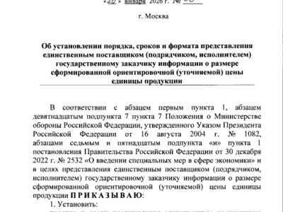 Приказ Министра обороны Российской Федерации от 26.01.2026 № 33 «Об установлении порядка, сроков и формата представления единственным поставщиком (подрядчиком, исполнителем) государственному заказчику информации о размере сформированной ориентировочной (уточняемой) цены единицы продукции» (Зарегистрирован 24.03.2026 № 85692) СКАЧАТЬ Приказ Министра обороны Российской Федерации от 26.01.2026 № 33